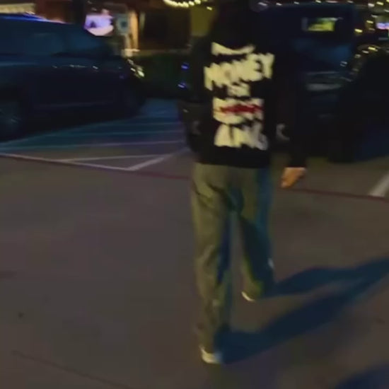 Back: White Puff letters NEED MONEY FOR RENT AMG red scratched off on rent.